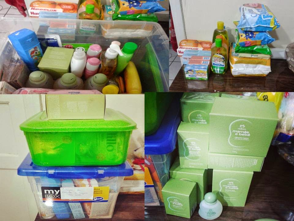 Na foto acima peguei todos os itens de higiene das bebês e anotei no evernote, coloquei em duas caixas, etiquetei e já separei o que levarei para maternidade e para a casa da minha mãe;